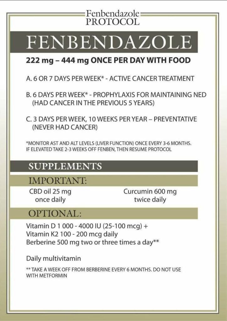 The FEN BEN protocol varies in dosage depending on the source… some sources say every day, others say once a week… given that cancer is an umbrella term for thousands of different diseases it is possible that not every cancer will respond to this FEN BEN protocol. This article isn’t meant to be treatment advice but it certainly gives hope to people that have otherwise been condemned by the system… dosing is the science of getting enough medicine to treat the disease without killing the patient…. and dosing is where the patient will obviously want to consult with the experts… here is an example of what the FEN BEN protocol looks like in some cases….